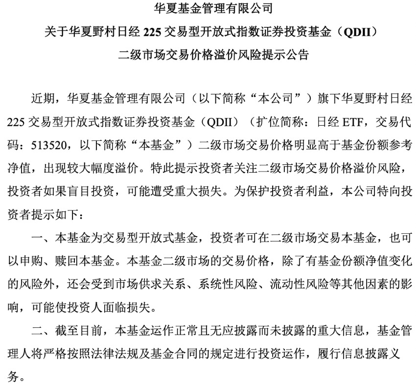 1月12日,华夏基金管理有限公司(下称“华夏基金”)发布一则关于华夏野村日经225ETF(QDII)二级市场交易价格溢价风险提示公告。