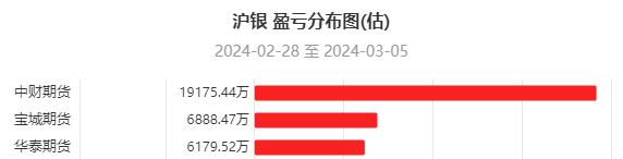 数据显示,一周内中财期货、宝城期货、华泰期货在沪银上盈利居前,三机构分别盈利19175.44万元,6888.47万元,6179.52万元。