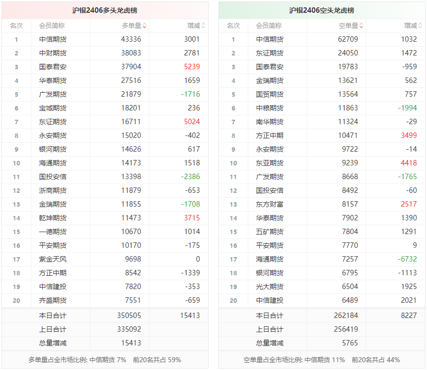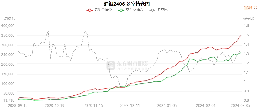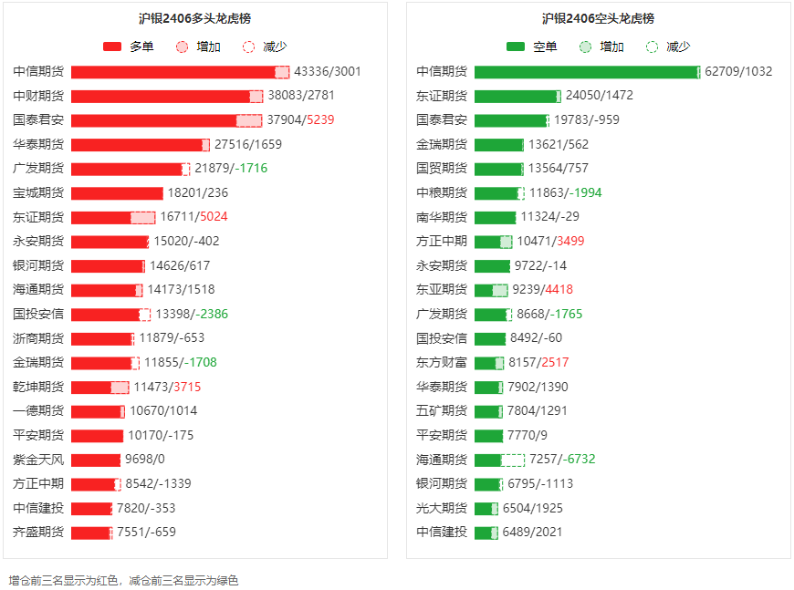 总体而言,沪银2406合约今日增仓上行,多空持仓排名前20席中,多空双方均呈进场态势,多头进场意愿强于空头。